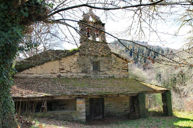 Construída no S. XVII, ten planta de cruz grega e unha espadana con dúas campás. Destaca especialmente o seu amplo soportal de lousa, como o resto da cuberta e as singulares escaleiras que conducen ao campanario, pola fachada da igrexa, algo nada frecuente. Integrada nun espeso souto de castiñeiros, a presenza do cemiterio próximo e a vexetación que cobre boa parte da súa superficie, ademais das pegadas do paso do tempo e o abandono, outórganlle un caracter especial. Sen dúbida poderemos atopar unha infinidade de micropaisajes nesta contorna. Está integrada no Roteiro dous Pintores e moi preto, nunha vivenda próxima, hai un hórreo de grandes dimensións que merece a pena visitar.