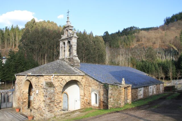 Aínda que formou parte dun mosteiro da orde do Císter, só se conserva esta igrexa de orixe románico. Ten pranta de cruz latina e destaca o amplo pórtico de lousa, con cuberta a dúas augas. Moi preto, na parte alta do pobo e nunha placiña, hai unha pequena capela, posiblemente privada. Máis alta que ancha, lembra a un torreón e na súa fachada principal ten un pórtico de lastras de lousa a tres augas, ao que se accede por unha cancela de ferro, a través dun muro, totalmente cuberto de vexetación.